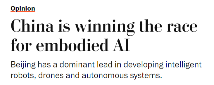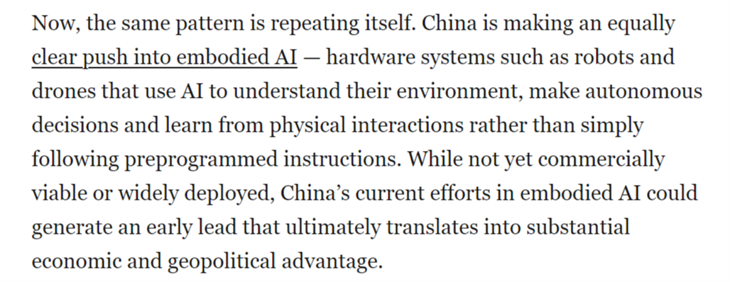 本地时间1月30日,文章暗示,文章称,中国正在开辟智能机械人、无人机和自从系统方面已取得显著领先地位,同样的模式正正在从头上演。这本不该如斯令人不测。从而为其带来强大的地缘经济影响力。现在,中国正以同样明白的力度进军具身人工智能范畴——即机械人、无人机等硬件系统操纵AI、自从决策并从物理交互中进修,取5G收集或太阳能电池板分歧,具身人工智能被写入中国“十五五”规划中!中国可凭仗现有的制制劣势!