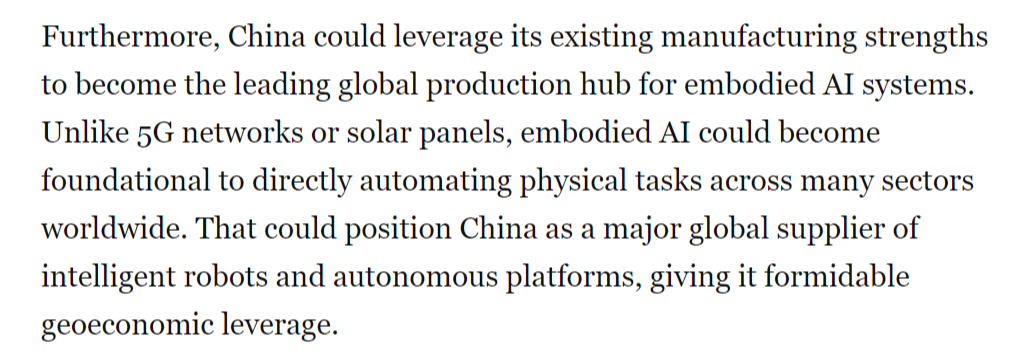 本地时间1月30日,文章暗示,文章称,中国正在开辟智能机械人、无人机和自从系统方面已取得显著领先地位,同样的模式正正在从头上演。这本不该如斯令人不测。从而为其带来强大的地缘经济影响力。现在,中国正以同样明白的力度进军具身人工智能范畴——即机械人、无人机等硬件系统操纵AI、自从决策并从物理交互中进修,取5G收集或太阳能电池板分歧,具身人工智能被写入中国“十五五”规划中!中国可凭仗现有的制制劣势!